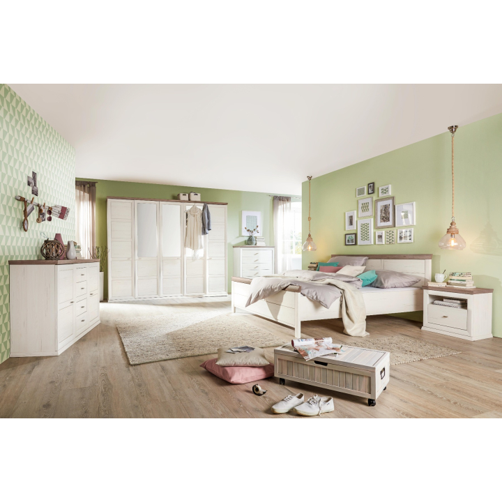 Настоящата оферта е за покупка на спална гарнитура от две шкафчета, легло и петкрилен гардероб, но в зависимост от нуждата от допълнително обзавеждане може да закупите и контрабюфет, холна секция, ниска витрина, пейка за антре, огледало, закачалка за антре, трапезна маса, шкаф за обувки, холна маса, трикрилен или четирикрилен гардероб.