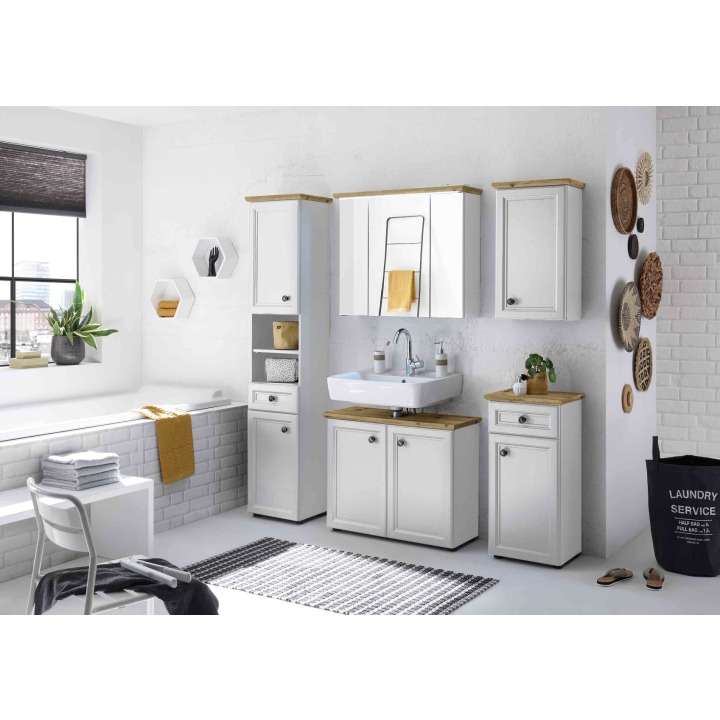 Комплект за баня ТОСКАНА има класическа и стилна визия и предлага 5 функционални модула: Долен шкаф за мивка, горен шкаф с огледални врати, долен и горен тесни модули и колонка. Красивият декоративен профил на вратите, металните дръжки топче и дебелите декоративни тавани в топъл дървесен декор, подчертават изисканата визия и внасят топлина и усещане за уют и комфорт в банята. Материалите са влагоустойчиво ПДЧ и врати от МДФ с фолио. Да не се излага на директен контакт с вода.