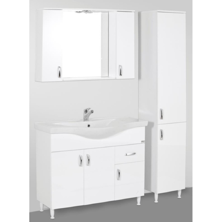 Комплект мебели за баня, състоящ се от долен, горен шкаф и висока колонка, огледало и керамична мивка, с класически дизайн и функционално разпределние. Мебелите са изработени от влагоустойчив MDF с меламиново покритие, в бяло. Няма възможност за избор на допълнителни цветове.