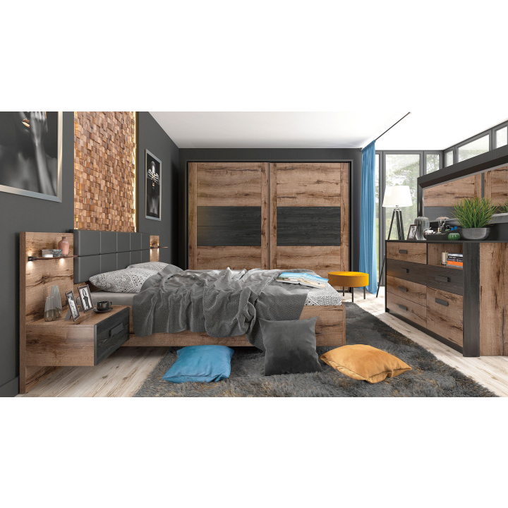 Мебелите са декорирани в тъмнодървесен цвят (дъб монумент), но някои елементи, като фронтовете на нощните шкафчета и част от вратите на гардероба, са боядисани в черно с дървесен нюанс (черен дъб). За изработката на спалната гарнитурата са използвани ПДЧ и еко кожа.