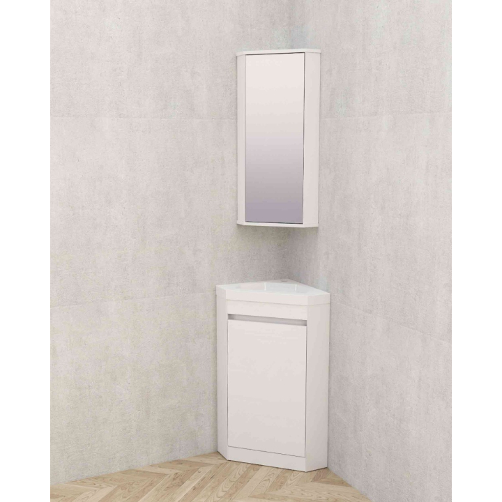 Опилзотворете оптимално дори най-малкото налично простраство. Комплект за баня КОРНЕР е изработен от PVC, в бяло, с бяла порцеланова мивка и горен ъглов шкаф с огледало. С изчистен дизайн и функционално разпределние. Няма възможност за избор на допълнителни цветове.