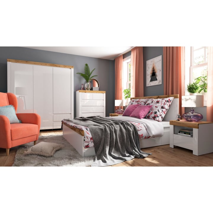 Какво съдържа сетът? При покупка получавате спалня, две нощни шкафчета и гардероб. Допълнително може да закупите чекмедже към леглото и комод с шест чекмеджета.