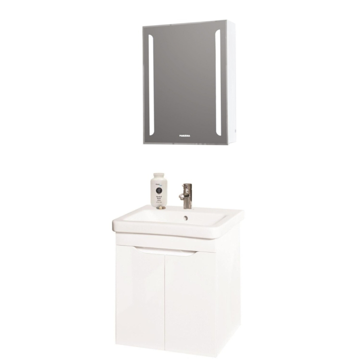Комплект за баня ХЕЛИОС е изработен от водо и влагоустойчив материал и се състои от долен PVC шкаф с две врати в Бяло, с изчистен дизайн и функционално разпределние и плитък горен шкаф с огледална врата и LED осветление. Специалното формообразуване на лицето замества дръжките. Няма възможност за избор на допълнителни цветове.