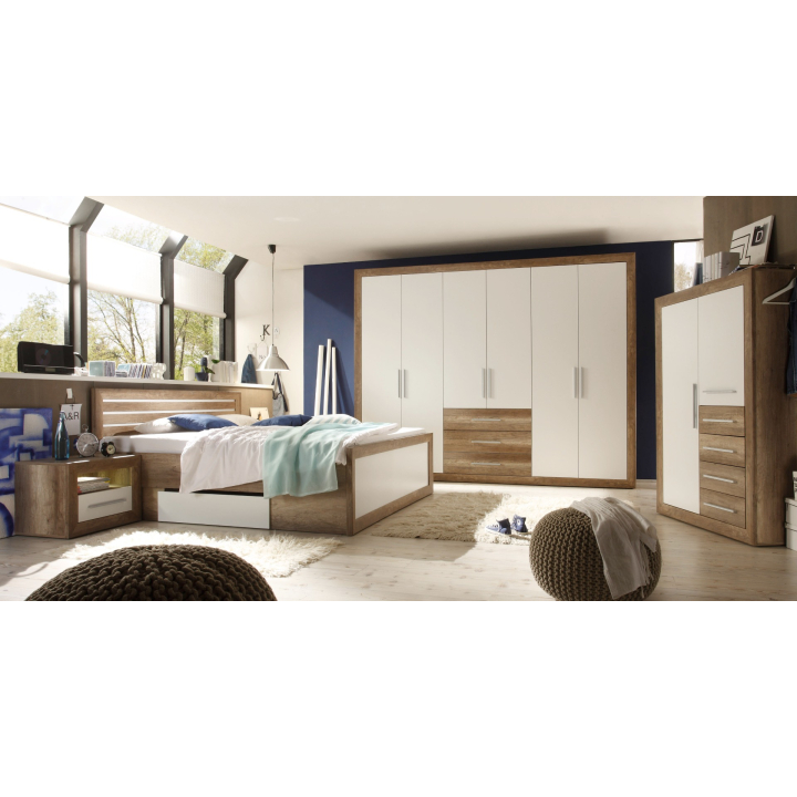 Комплектът се състои от комфортно и просторно легло за матрак 180/200см, с включени 2 бр. чекмеджета, 2 нощни шкафчета с осветление, огромен 6-крилен гардероб, удобен комод с 2 врати и 4 чекмеджета и допълнителен двукрил гардероб.