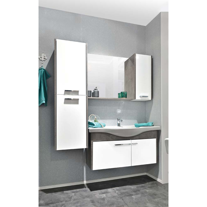 Комплект мебели за баня МАРМАРА се състои от долен шкаф за окачване без крака, с керамична мивка, горен шкаф с огледало и колнка Комплектът е с изчисен дизайн и функционално разпределние. Мебелите са изработени от влагоустойчив MDF с меламиново покритие, в комбинация бяло и ретро сиво. Няма възможност за избор на допълнителни цветове.