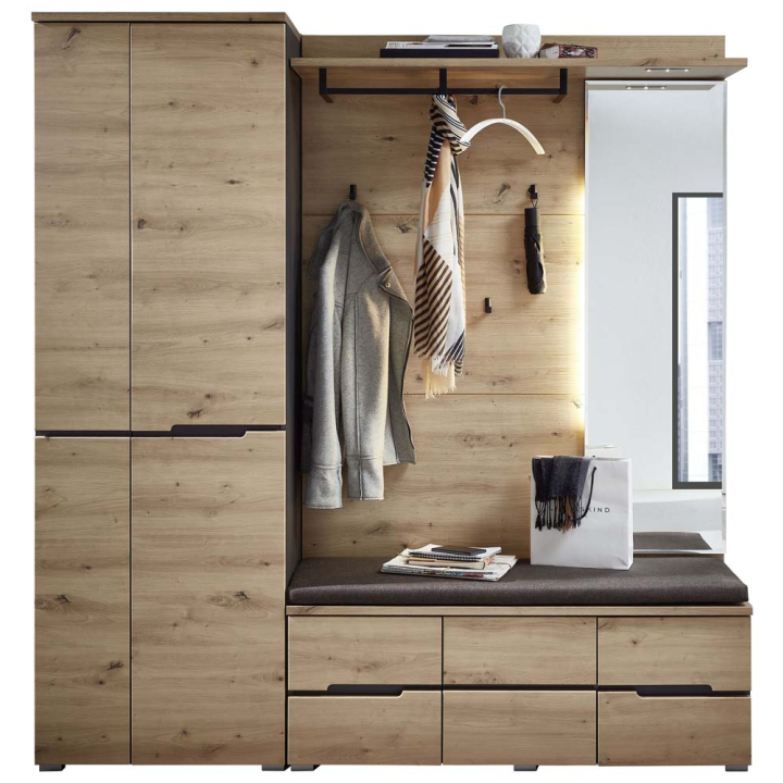 Модулна система за антре Детройт е стилно и функционално предложение за входното антре. То ще ви предостави възможност за удобно съхранение на всички връхни дрехи, обувки и пантофи. Красивият и топъл дървесен декор хармонира перфектно с акцентите в графит, а дискретното LED осветление подчертава естественото му въздействие.