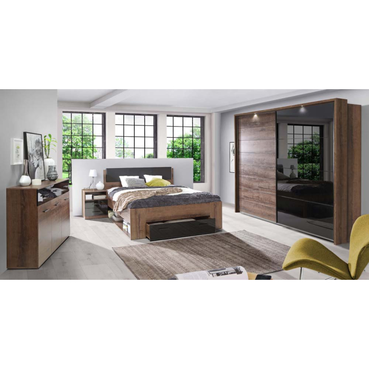 Настоящото предложение за покупката на спална гарнитура е за гардероб, спалня и две нощни шкафчета. Комплектът спални мебели ще привлече вашето внимание със своя луксозен дизайн. Цветовото съчетание на мебелите е черен с тъмен дървесен декор, придаващо висок стандарт и класа към помещението.