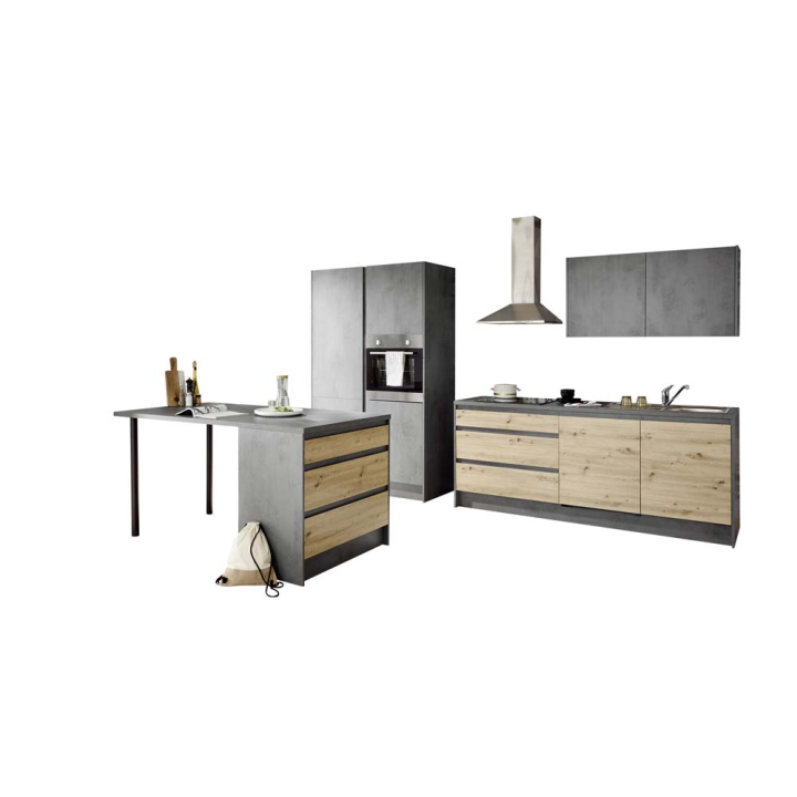 Модерна и атрактивна кухня, състояща се от блок кухня (два горни модула, модул за мивка, модул за миялна, модул с три чекмедже, висок модул за вграждане на хладилник и фурна), както и кухненски остров. Мебелите са в декори Бетон Антрацит и Дъб Артисан. Фронтовете на чекмеджетата и вратичките са без дръжки и допринасят за изчистената и съвременна визия. Корпусът и фронтовете на мебелите са произведени от 16 мм фолирано ПДЧ. Плотът на кухнята е термоустойчив с дебелина 38 мм и размери 235/60 см. Функционалният кухненски остров е с три чекмеджета и два метални крака в черен цвят Ш:180/Д:90/В:91 см.