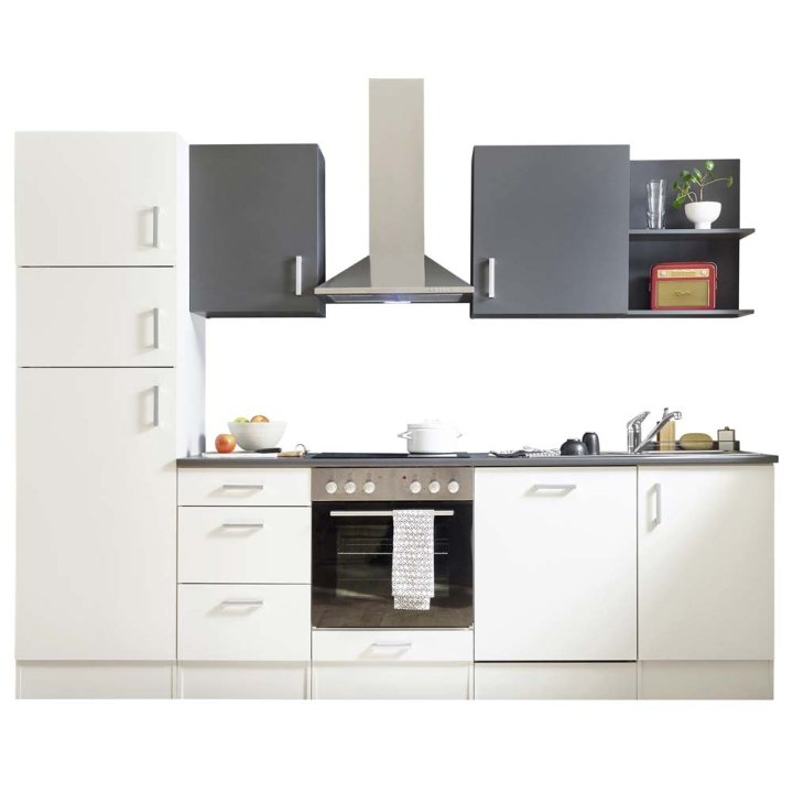 Компактна линейна кухня, състояща се от блок кухня (два горни шкафа, етажерка, шкаф за мивка, корпус съдомиялна, корпус фурна, долен шкаф), както и шкаф за хладилник. Кухнята е стилна комбинация от бяло и сиво. Горните шкафове са в тъмносив цвят, а долните шкафове в бяло, с включен плот. Шкафът за хладилник към комплекта е изцяло в бяло. Шкафовете са с гладко покритие, изработени от 16 мм фолирано ПДЧ. Термоплотът към кухнята е с дебелина 28 мм в антрацит.