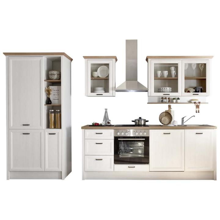 Елегантна линейна кухня състояща се от блок кухня (два горни модула, модул за мивка, модул съдомиялна, модул за фурна, модул шкаф с три чекмеджета), както и висок модул. Мебелите се отличават с красива фрезовка по периферията, както и вратички със стъклени витрини. Цялостната декорация на кухнята е в бяло, като единствено плота, рафтовете и декоративната лайсна на горните шкафове е в светъл дървесен декор. Прекрасно би се вписала в интериора на всяка кухня. Мебелите са изработени от 16 мм фолирано ПДЧ (корпус) и 22 мм ПДЧ (лице).
