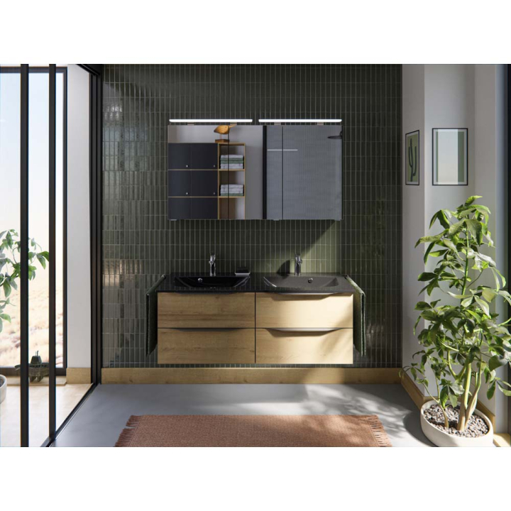 -Луксозен шкаф за баня в светъл дървесен декор с четири чекмеджета с размери на продукта Ш:130/Д:46/В:48.2 см;