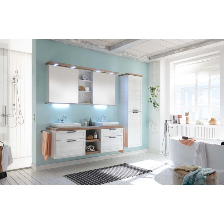 Стилен комплект влагоустойчиви мебели за баня. Сетът се състои от горен огледален шкаф, долен шкаф за баня, както и две порцеланови мивки.
