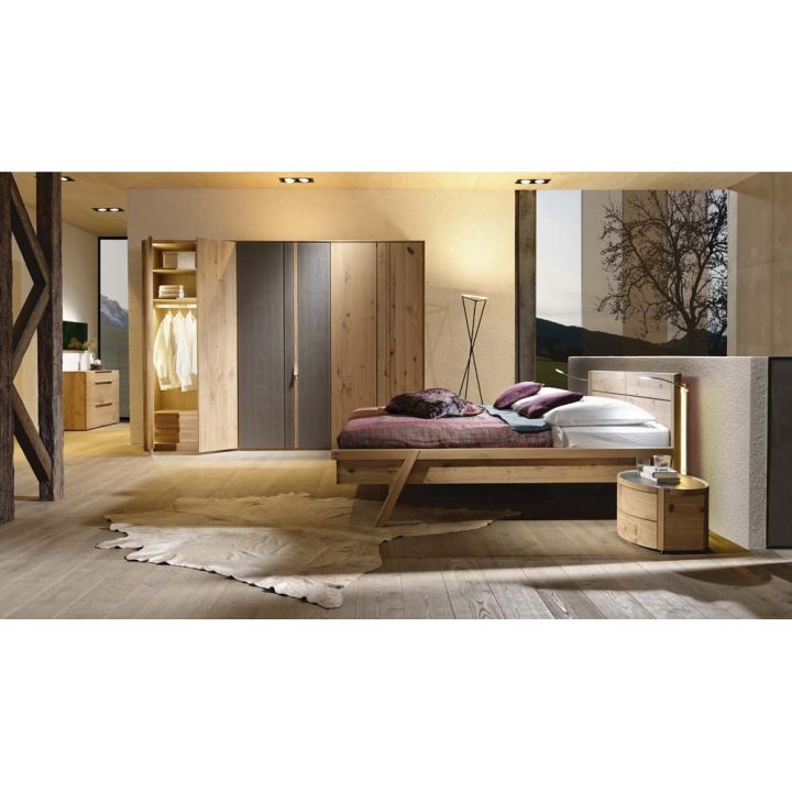 Спалният комплект е проектиран за създаването на луксозна и уютна атмосфера в спалнята за комфортен и пълноценен сън с възможност за лесното и практично съхранение на различни по вид и предназначение дрехи. При изработката на мебелите са използвани висококачествени естествени материали като фурнир, масив, метал и стъкло. Мебелите от серията притежават съвременен рустикален чар и стил. Комплектът се състои от: