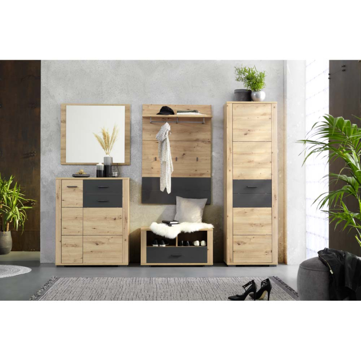 Комплектът за антре е проектиран да осигури удобно място за съхранение на дрехи, лични вещи и аксесоари във входното помещение. Мебелите от серия Максим са произведени от ПДЧ, със съвременен дизайн в сив цвят и светъл дървесен декор. Състои се от: