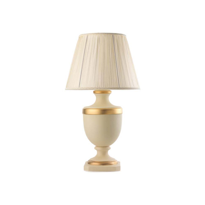 Ръчно изработена лампа в стил ампир - всяка зона, която й отредите, ще се преобрази с категорична елегантност! Вдъхновен от непреходни течения в изкуството, този очарователен дизайн ни пренася в епохи, наситени с емоции и в свят на благородство. Вниманието към детайла грабва от пръв поглед и превръща настолната лампа в желан аксесоар в частни домове, изискани хотели, ресторанти или бутици. Формата на стойката напомня древноримските керамични вази, абажурът е с плътен цвят слонова кост и фино надиплен, а в завършек са ръчно нанесените златисти ленти.
