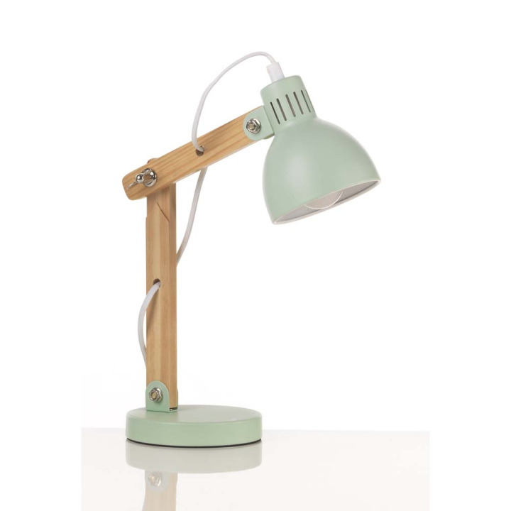 Настолна лампа с дървено рамо и абажур от светлозелен метал, 1хЕ14, 23/23/38 см