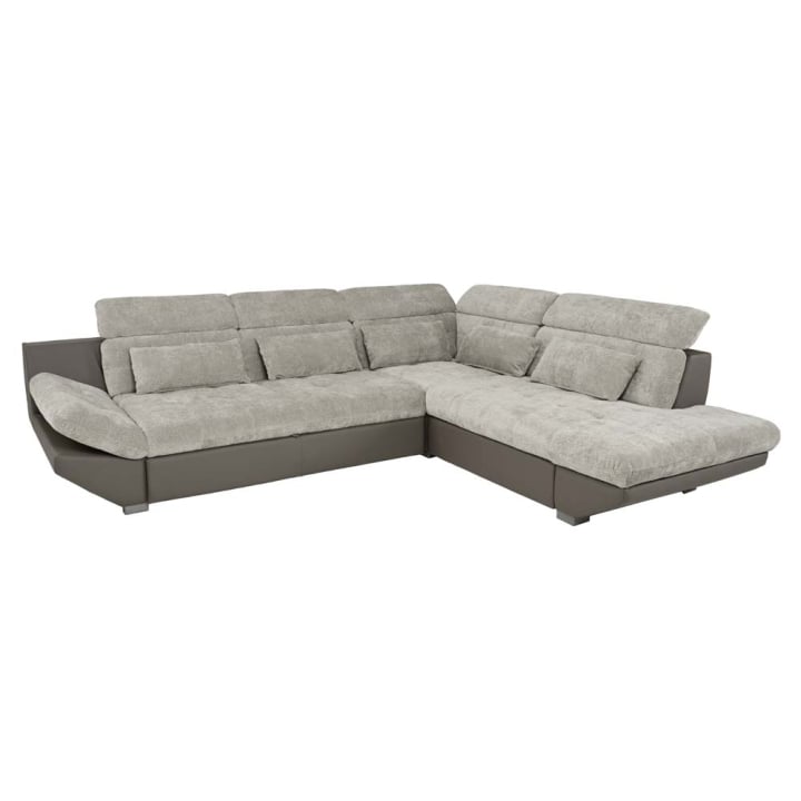 Ъглова холна гарнитура Итърнити с дясна лежанка, функция сън, чекмедже и включени 5 лумбални възглавници, тапицарана в сив текстил и кафява еко кожа, размери: 307/255/80 см