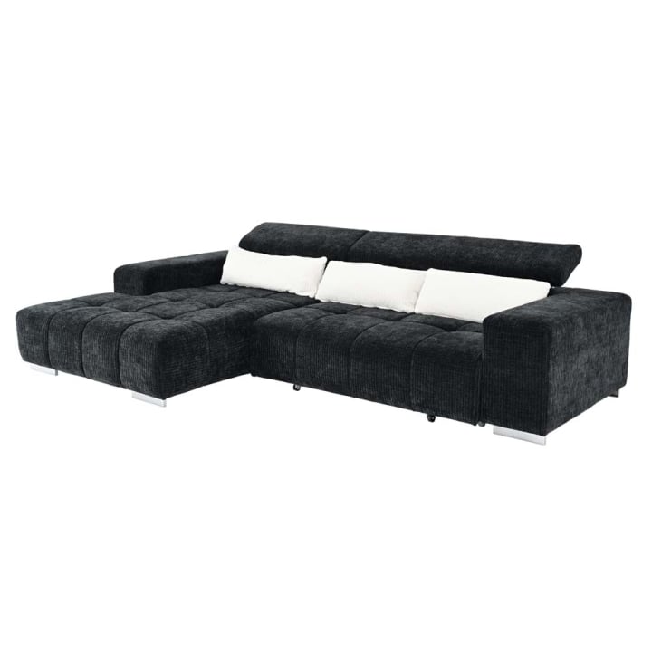 Черна ъглова холна гарнитура с лява лежанка, функция релакс, подвижни подглавници и 3 бежови лумбални възглавници, размери: 303/185/73 см