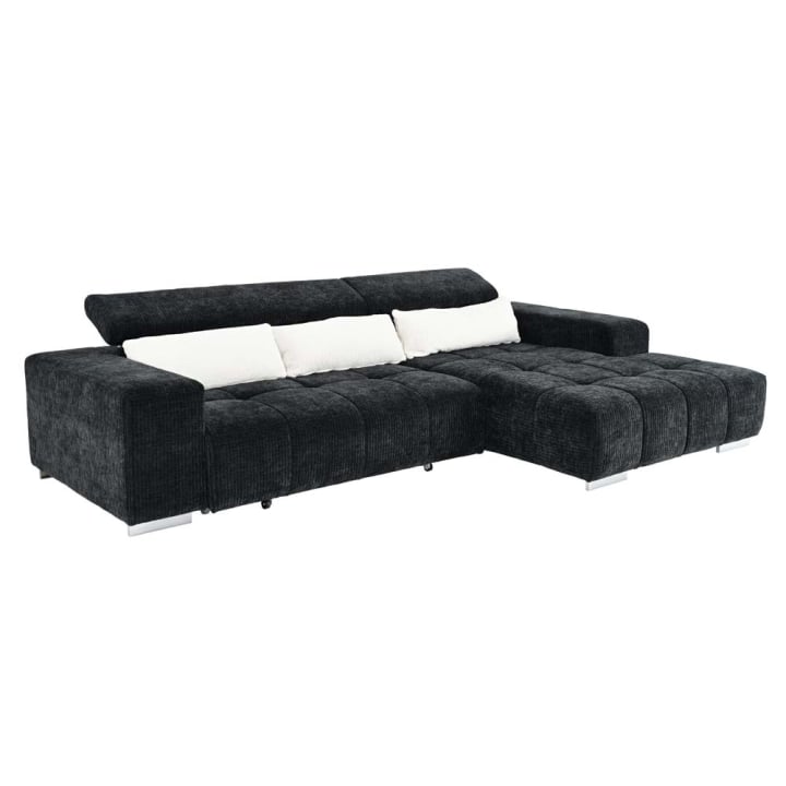Черна ъглова холна гарнитура с дясна лежанка, функция релакс, подвижни подглавници и 3 бежови лумбални възглавници, размери: 303/185/73 см