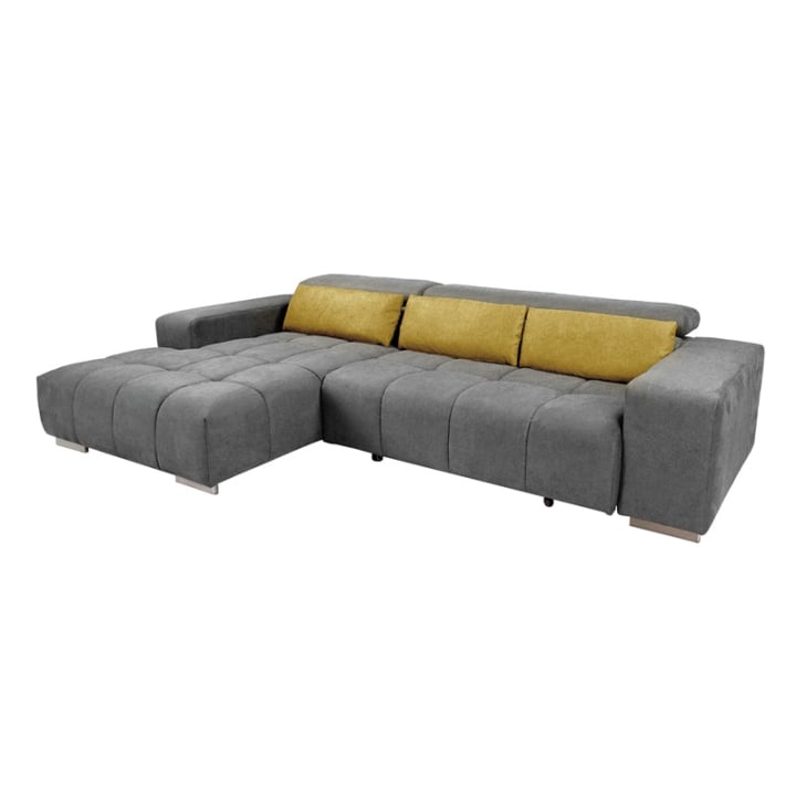 Комфортна Г-образна холна гарнитура с размери Ш:303/Д:185/В:73 см. Тази стилна и красива холна гарнитура разполага с дълбока капитонирана седалка за оптимален комфорт, с пълнеж от пяна и зиг заг пружини. Облегалката е с подвижни подглавници, с пълнеж от пенополиуретанова пяна и статични колани. Обширната лежанка предлага допълнителен комфорт и удобство на които може да се насладите във всеки един момент и да се радвате на заслужена почивка. Моделът разполага с функция релакс (издърпване на седалката напред) и подвижен подглавник, които ще допринесат за вашия по-голям комфорт и удобство по време на седене. Конструкцията е произведена от масивна дървесина (бук и смърч), стилно тапицирана с висококачествена дамаска, поставена на хромирани крачета. Към гарнитурата получавате три лумбални възглавници в дамаска с цвят горчица. Насладете се на дълги уютни нощи или мързеливи дни, сгушени на тази мека мебел. Идеалното местенце за гледане на телевизия или четене на книга през свободното време.