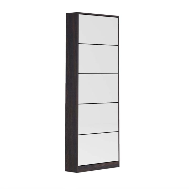 Практичен шкаф за обувки, разполагащ с 5 самостоятелни отделения, в които може да съхранявате около 20 чифта обувки. Притежаващ изчистен, огледален облик в тъмен дървсен декор, ще допринесе с функционалност и приятна визия, която да ще ви приветства ежедневно.