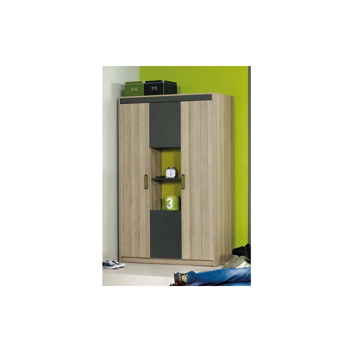 Гардероб с четири врати с размери Ш:127/Д:57/В:200 см. Моделът разполага с три самостоятелни отделения, както и отворена ниша с рафт. В лявото отделение е монтиран лост за закачалки и един нисък рафт. Средното отделение е под отворената ниша с монтирана врата на панти. Дясното отделение е с монтиран лост за дрехи и горен рафт, продължаващ към средата на гардероба. Предвидливо, лостът в дясното отделение е монтиран на височина около 1 м и по този начин достъпен и за послушните малчугани. На лявата врата от вътрешната страна е монтирано кристално огледало, в което винаги може да се огледате. Гардеробът е здрав и стабилен произведен от висококачествено ПДЧ в три декора. Конструкцията с цокъл и страничните врати са в светъл дървесен декор, а двете средни малки врати в антрацитен цвят. Гърбът на отворената ниша е в зелен цвят, добавящ младежки стил към модела и помещението.