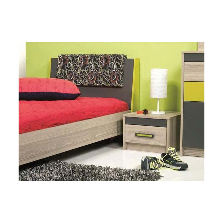 Нощно шкафче с чекмедже с размери Ш:44/Д:44/В:35 см. Моделът е със стабилна конструкция произведена от ПДЧ, здраво стъпил по цялата повърхност на пода. Височината на продукта е съобразена с височината на леглото така че, всички вещи поставени на него да са лесно достъпни. Разполага с чекмедже, където повечето дреболийки ще намерят своето място. Цветовата декорация е много атрактивна. Цялостно е декориран в светъл дървесен декор, като единствено правоъгълна ивица под плота е в сив цвят, а дръжката е оцветена в сиво и зелено.