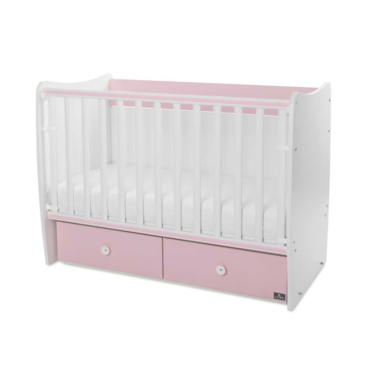 Компактно и функционално, детското легло е проектирано с грижа за родителите и най-вече за дългосрочния комфорт на малкия човек вкъщи. Може да се използва още от първия ден, когато бебето е съвсем мъничко, чрез механизма за повдигане на подматрачната рамка на по-високо ниво и функцията за люлеене. Предвидени са две чекмеджета с идеално място за съхранение на дрешки и аксесоари. При порасналия малчуган, основата се сваля до долу, а две летви от решетката се отделят, за да му е удобно да влиза и излиза самостоятелно. Имате възможност и за пълно отстраняване на решетката.