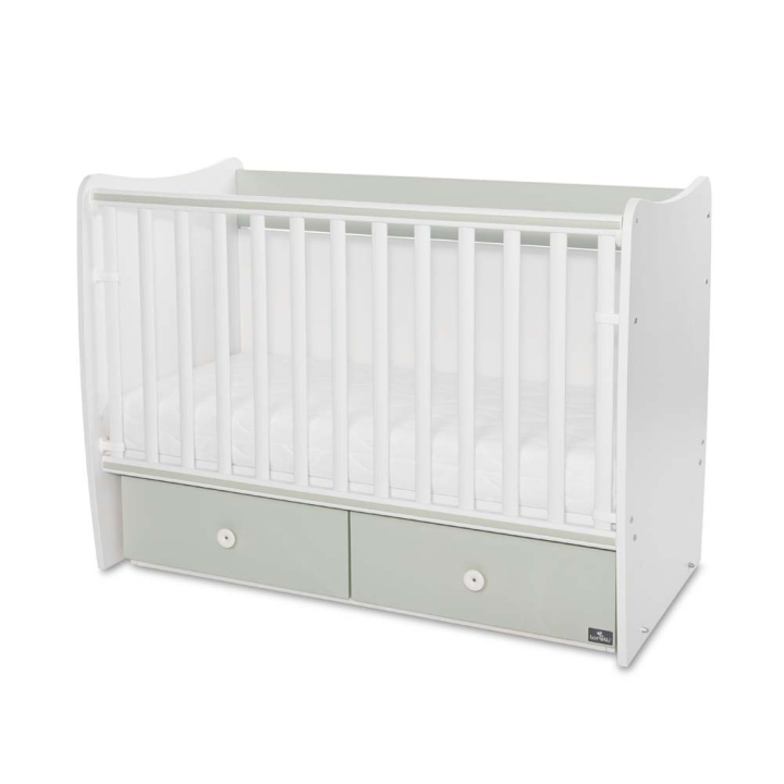 Компактно и функционално, детското легло е проектирано с грижа за родителите и най-вече за дългосрочния комфорт на малкия човек вкъщи. Може да се използва още от първия ден, когато бебето е съвсем мъничко, чрез механизма за повдигане на подматрачната рамка на по-високо ниво и функцията за люлеене. Предвидени са две чекмеджета с идеално място за съхранение на дрешки и аксесоари. При порасналия малчуган, основата се сваля до долу, а две летви от решетката се отделят, за да му е удобно да влиза и излиза самостоятелно. Имате възможност и за пълно отстраняване на решетката.
