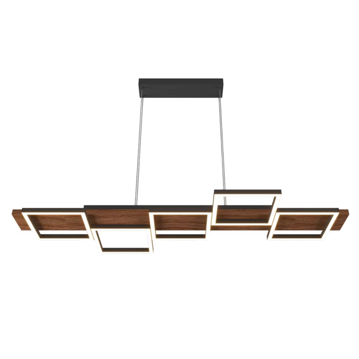 Таванен осветител, проектиран с красива дървена повърхност, върху която са монтирани 5 квадрата в асиметрия. Светещите фигури се преплитат в интересна композиция и оформят атрактивна и нестандартна зона, в същото време допълват интериора с магичен ефект. Подходящ е за всеки вид помещение, включително за офис или заведение, носещ модерен облик, свеж акцент и успокояващо въздействие.