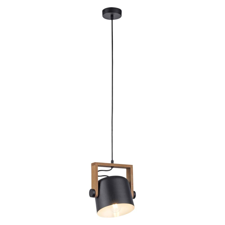 Ефектната единична лампа се спуска елегантно от тавана, във форма от черен метален корпус, захванат с дървена рамка. Имате възможност да я насочвате, благодарение на подвижния механизъм и да осветите помещението под интересен ъгъл. Монтирайте няколко пендела един до друг, насочете ги според моментните предпочитания и постигнете уникална визия на интериора в модерен индустриален стил.