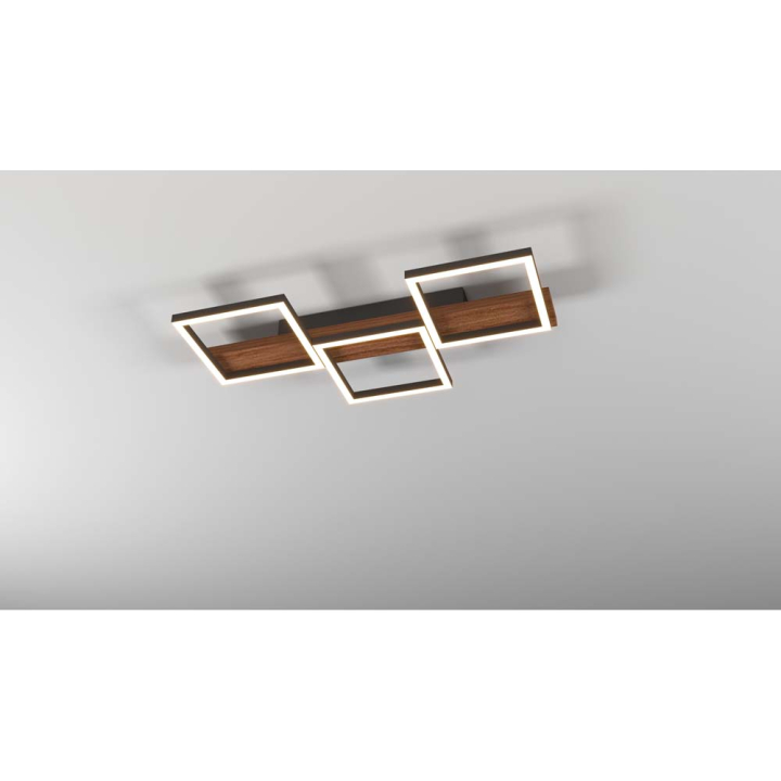 Таванен осветител, проектиран с красива дървена повърхност, върху която са монтирани 3 квадрата в асиметрия. Светещите фигури се преплитат в интересна композиция и оформят атрактивна и нестандартна зона, в същото време допълват интериора с магичен ефект. Подходящ е за всеки вид помещение, включително за офис или заведение, носещ модерен облик, свеж акцент и успокояващо въздействие.