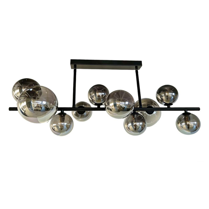 Истинско произведение на съвременното изкуство, това таванно бижу ще внесе присъствие, провокиращо възхита и удивление! Плафониерата е проектирана с цели десет стъклени абажура във форма на опушени сфери с индивидуални размери, разположени асиметрично с невероятна привлекателност. Блестящата огледална повърхност отразява пространството наоколо и превръща интериора в дизайнерско арт решение. Благодарение на дължината си от 85 см, върху която проблясват абажурите, плафониерата е чудесно решение за осветление над холната маса, но и във всеки друг интериор ще озари с ефектна естетика. Десетте фасунги G9 позволяват свободен избор на крушки, затова LED крушките са най-доброто решение, благодарение на своята дълготрайност и икономичност.