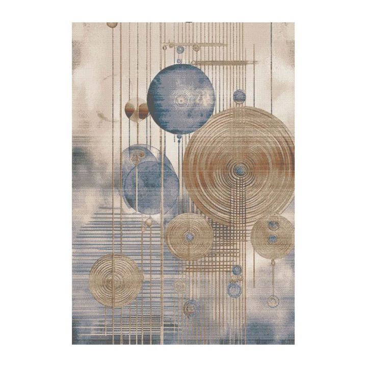 Килимът е с модерен артистичен дизайн. Кръговите елементи, напомнящи годишни дървесни пръстени и небесни сфери, създават усещане за движение и хармония. Съчетанието на топлите бежови тонове и хладните сини нюанси придава елегантен баланс, подходящ както за съвременни, така и за по-класически интериори. Стилен акцент за дневна, спалня или офис, който ще внесе усещане за уют и изтънченост.