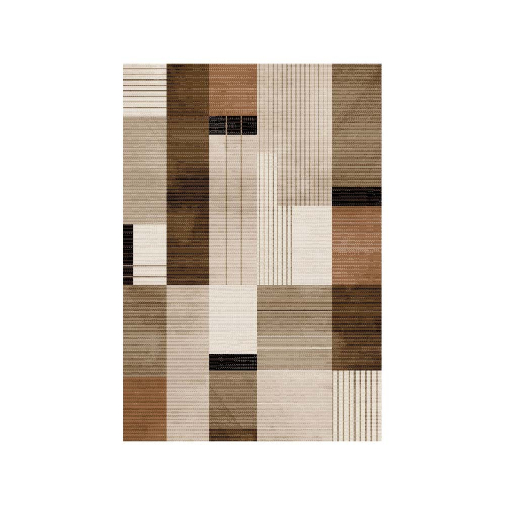 Килимът е с модерна комбинация от геометрични форми и текстурни ефекти. Различните мотиви създават интересна и хармонична композиция. Топлите тонове придават уют и стил, а разнообразието от текстури добавя дълбочина и характер. Подходящ избор за дневна, спалня или офис, където ще внесе модерна естетика и топла атмосфера.
