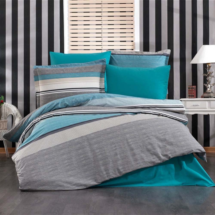 Комплектът е съчетание от стил, комфорт и свежест в спалнята. Хармонията между сиво и синьо създава усещане за релакс и уют, и е подходяща за всеки интериор. А високото качество на текстила ще съхрани дълготрайно неговата структура, както и първоначалните свежи нюанси на цветовете.