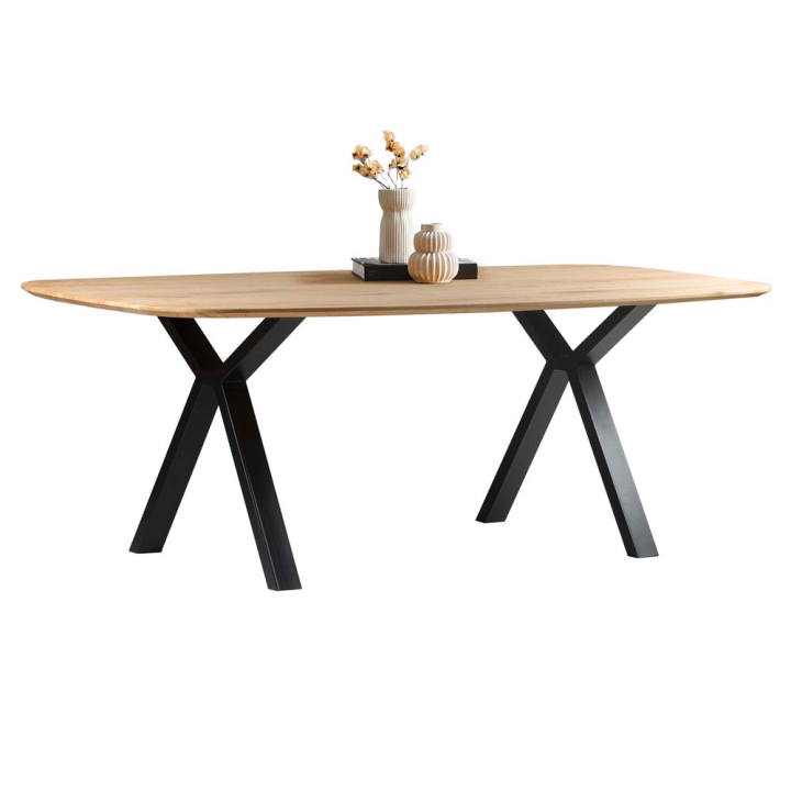 Тази впечатляваща маса съчетава здравината на студеният метал и топлината на естественият дъбов масив. Плотът с фино заоблени ръбове натурален финиш излъчва неподвластна на времето елегантност. Металните крака с кръстосана геометрия добавят стабилност и характер, превръщайки масата във фокусна точка на всяка трапезария.