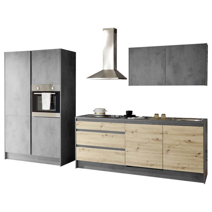Нестандартна и атрактивна блок кухня, в комбинация от Декори Антрацит и Дъб Артисан и термо плот 3,8см в декор Хромикс. Габаритен размер: 335/60/211 h см за комбинацията от шкафове за мивка, фурна и котлони.