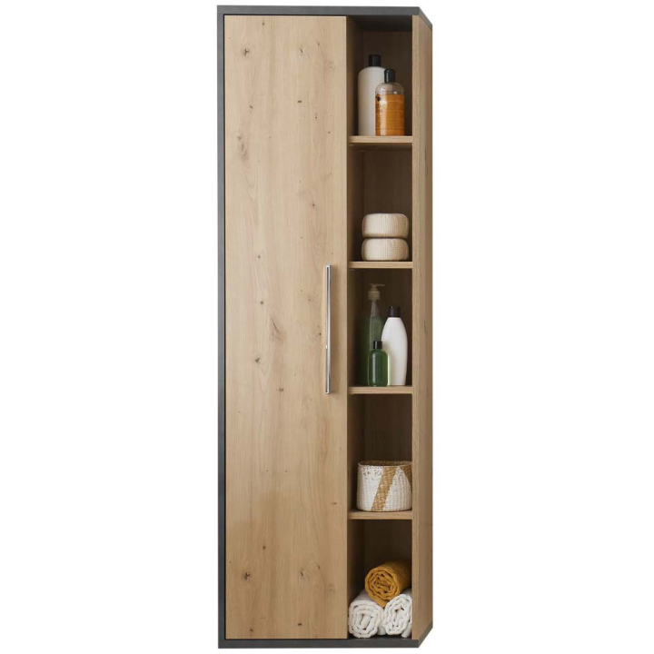 Висок шкаф за баня с размери Ш:50/Д:31/В:160 см. Моделът се отличава с красива декорация в сив цвят и светъл дървесен декор, като хромираната дръжка на вратата напълно допълва цялостната визия на модела. В шкафа, на четирите регулируеми рафта удачно може да съхранявате вещи, които по принцип държим в банята, така и красива декорация във външните нишите.