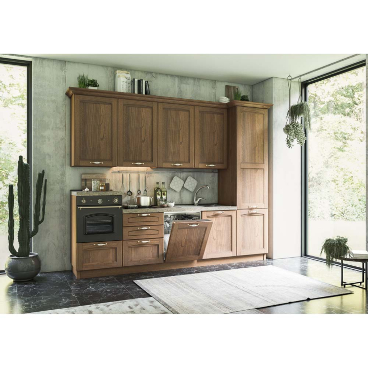 Дизайнът включва фрезовани врати в тъмен дървесен декор, съчетани с метални дръжки в ретро стил за уют и топлина у дома. Моделът разполага с практичен термоустойчив плот в гранитен декор и включва всички основни електроуреди и мивка, като предлага удобство за ежедневна употреба и лесно комбиниране с други мебели.