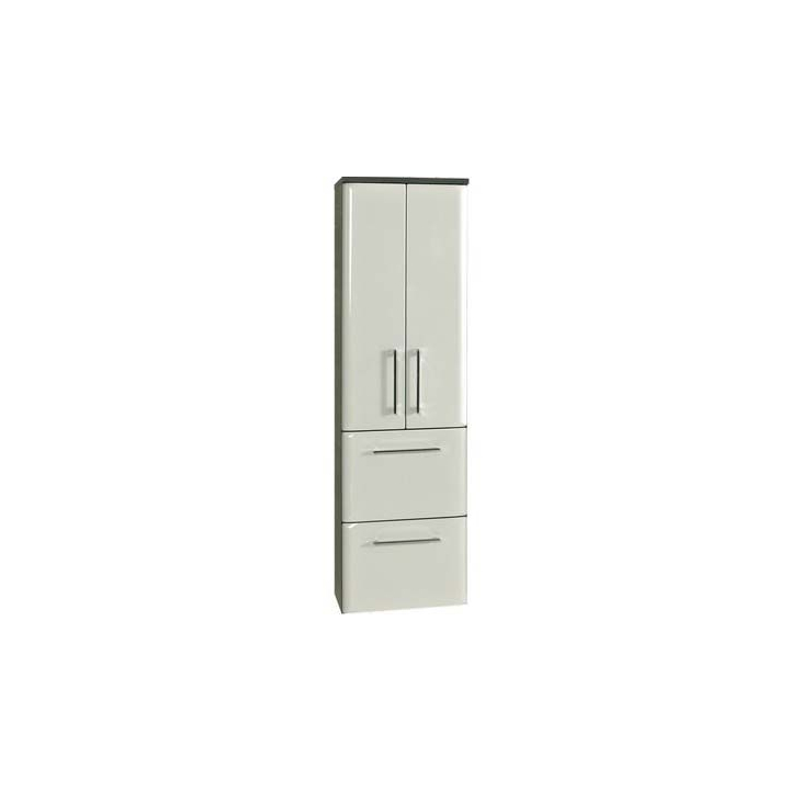 -2 дълбоки чекмеджета -2 врати -2 рафта -Фасада (лице): 979 гланц Бял -Корпус: сив с дървесен фладер -Дръжка: лъскав хром -Предназначен за монтаж на стена -Плавно затваряне -Влагоустойчив