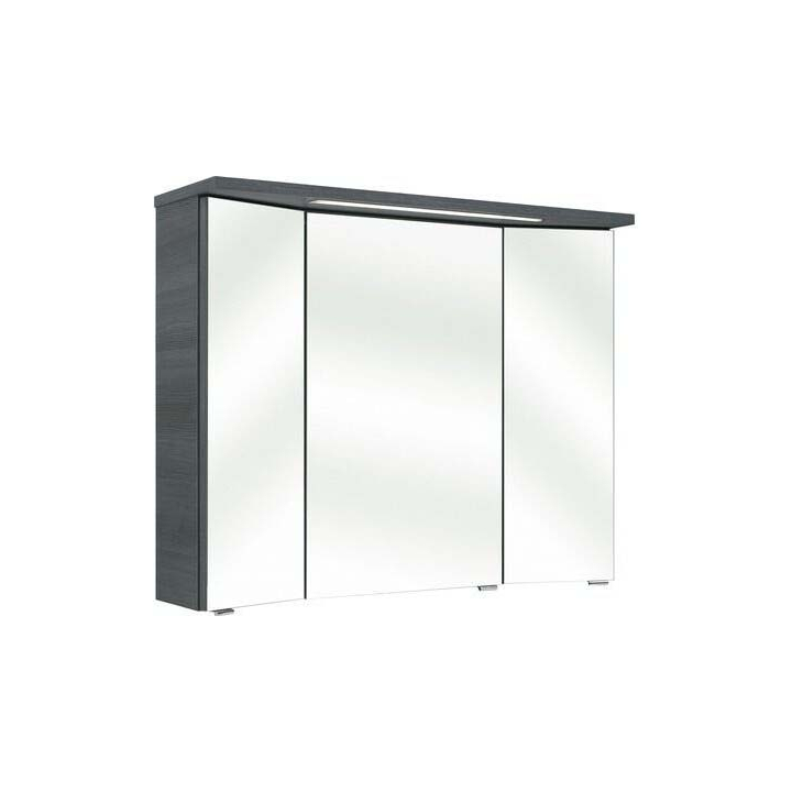 -3 огледални врати -6 рафта -таван с вградено LED осветление -Корпус: сив с дървесен фладер -Предназначен за монтаж на стена -Плавно затваряне -Влагоустойчив
