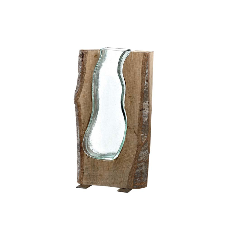 Дизайнерската изработка впечатлява най-вече с атрактивната идея и след това с красивата симбиоза между двата материала - стъкло и дърво. Поставката действа хармонично и едновременно екзотично със своята естествена красота на структурата. Кората на дървото, пръстените, леките кухини добавят в атмосферата живо, натурално излъчване. Решението за асиметрична вътрешна форма подправя още повече очарованието и земната харизма.