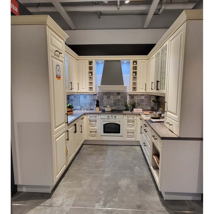 Дизайнерска П-образна кухня с ширина 270+264+225 см, с обща височина 250 см. Впечатлява с красив дизайн с винтидж мотиви, обширни кухненски плотове, голяма функционалност и практично място за съхранение. Проектирана е с овални линии, декоративни елементи от масив, рамки, пиластри, корнизи, метални дръжки с красива форма. Стъклените витрини са майсторски изработени с метални шпросни, зад които е монтирано LED осветление. Произведена е с внимание към детайла, от висококачествени материали и механизми. Разполага с горни, долни и колони кухненски шкафове с монтиран стенен панел, плот, мивка, смесител и електроуредите за вграждане. Вратите и чекмеджетата са с плавно затваряне произведени от MDF в бял цвят (слонова кост) с монтирани метални дръжки с порцеланова апликация. Термоплотът е на работна височина 90.8 см с дебелина 38 мм в декор дъб Винтидж, който стои страхотно в комбинация с бялата слонова кост. Зад витрините, в нишата при аспиратора и под горния ред шкафове е монтирано LED осветление, което създава страхотна атмосфера. Кухнята започва и завършва с красиви декоративни фрезове в типичен винтидж стил. Най-удачно би стояла в П-образна ниша, но са възможни и други конфигурации.
