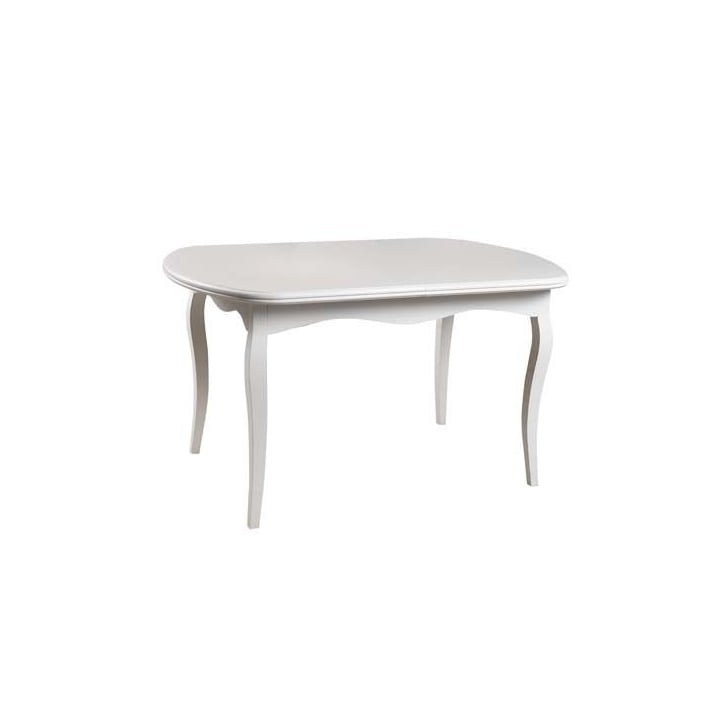 Трапезна разтегателна маса с размери Ш:140-180/Д:90/В:75 см. Масата се състои от елегантно извити крака от букова дървесина, прикрепени към овален плот, произведен от фурнирован MDF декориран с полиуретанов лак (мат). Плотът може да променя своята ширина от 140 см до 180 см, като по този начин спокойно може да настани от 4 до 6 човека. Със своята форма трапезната маса със сигурност ще внесе много чар, класа и домашен уют в дневната или трапезарията, а с белият си цвят ще добави чистота и свежест.