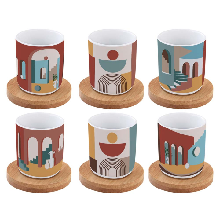 Завладяващ и много артистичен сервиз за кафе, идеален за хора с афинитет към изкуството. Абстрактните мотиви, свежите цветове, наравно с линиите на чашките и бамбуковите подложки са уникални, наситени с творчески заряд. Комплектът е опакован в красива кутия, подходяща за подарък.