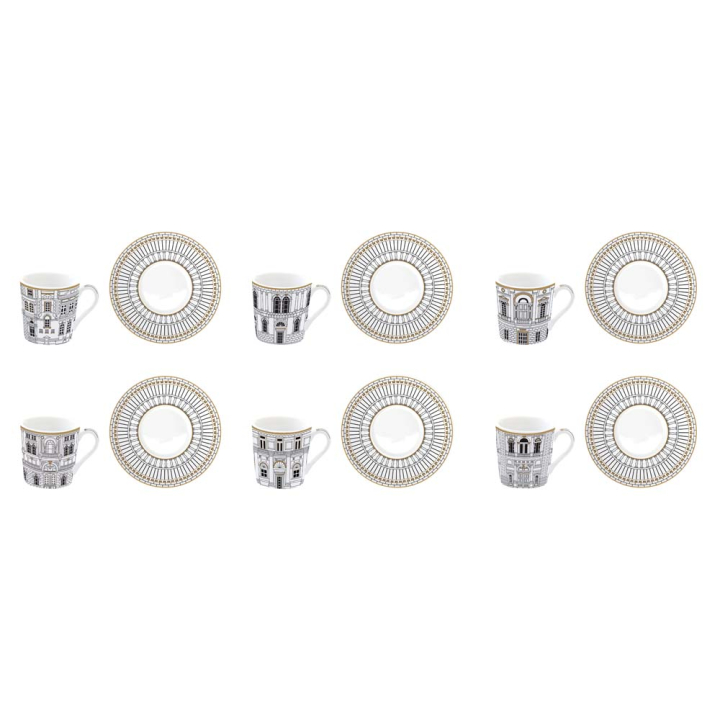 Сет с оригинален дизайн за поднасяне на кафе, идеален за ценителите на естетиката и изкуството. Автентичните архитектурни мотиви, пресъздадени графично, са съчетани с красиви нюанси на цветовете, с идея да ви пренесат в атмосфера, наситена с история. Комплектът е опакован в красива кутия, подходяща за подарък.