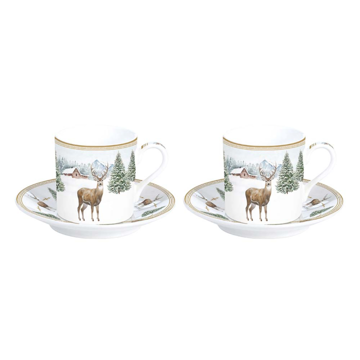 Комплект 2 бр. чаши за кафе х 75 мл с 2 бр. чинийки с декорация зимни горски мотиви в подаръчна кутия