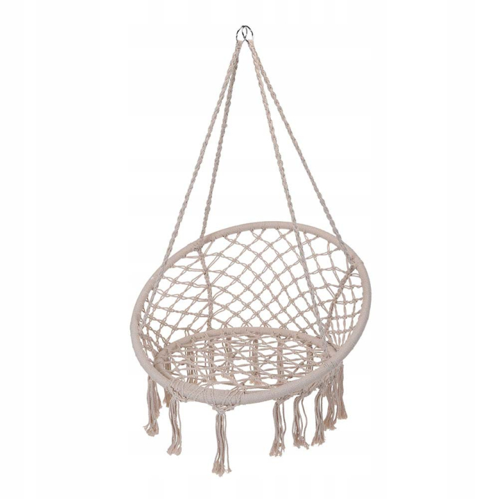 Градинска люлка за закачане, със здрава метална рамка и мрежа от дебели бежови въжета, вързани в долната част на артистични пискюли