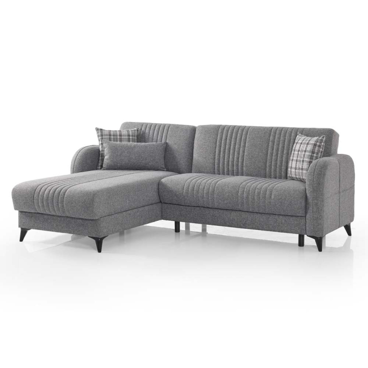 Сива ъглова холна гарнитура Лея с функция сън, ракла и 2 декоративни възглавници, размери: 244/175/93 см